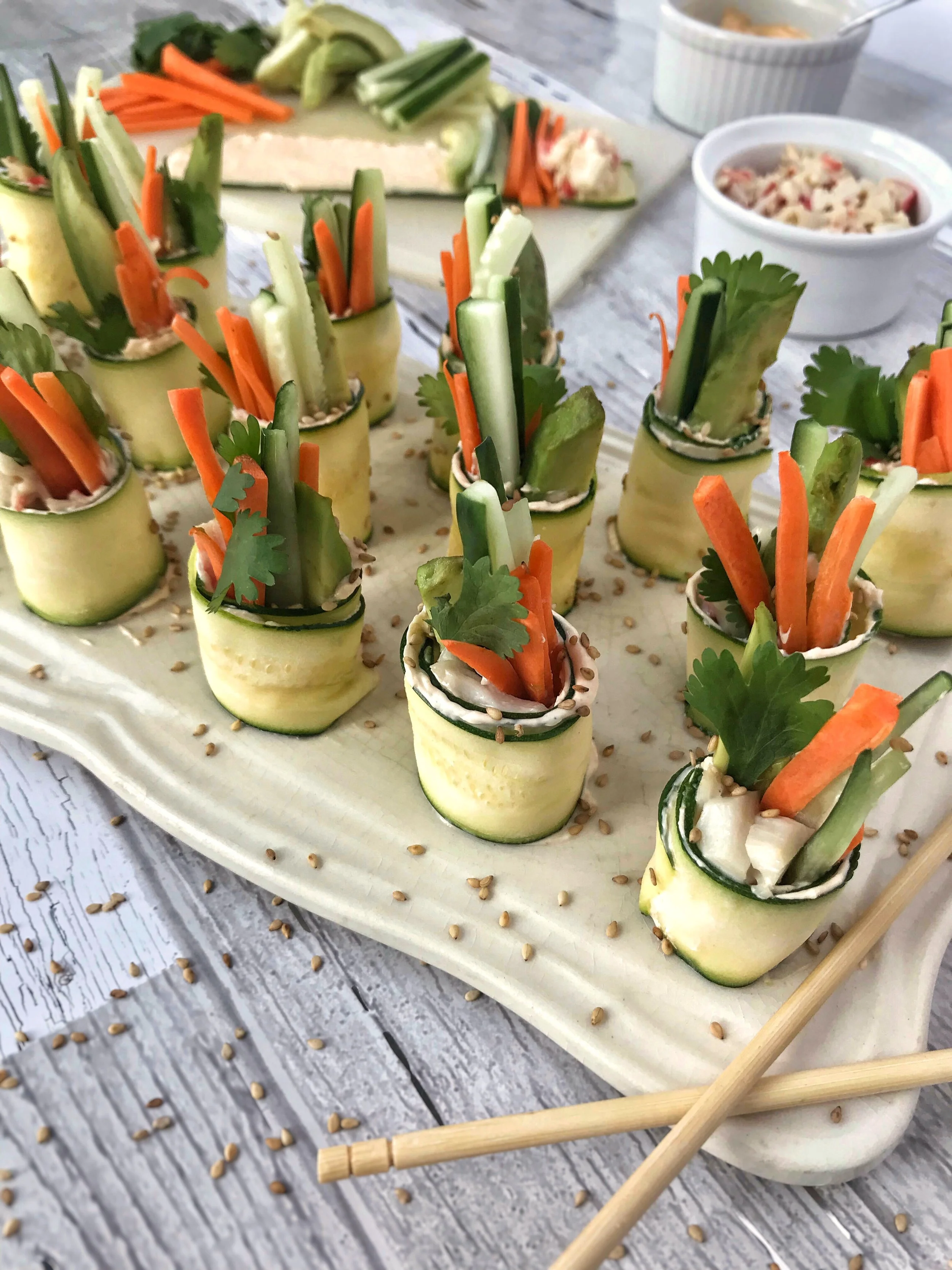 Nomster Chef Z Is For Zucchini Zucchini Sushi Fun Food Recipes For Kids To Make For Healthy Eating from images.squarespace-cdn.com Toss in the zucchini, and cook for 1 minute. Cut the ends off of zucchini using a vegetable peeler, and slice each zucchini into thin, long strips. 4 ounces cream cheese, softened. If cut too thick, they won't be baked properly. Repeat with the rolling and cutting until you reach the end of the squash. Lay zucchini strip flat and add a small spoonful of cashew mixture onto one of the ends of zucchini. Add a few matchsticks of veggies, avocado, and a couple of pieces of cilantro. Continue to slice the zucchini vertically.